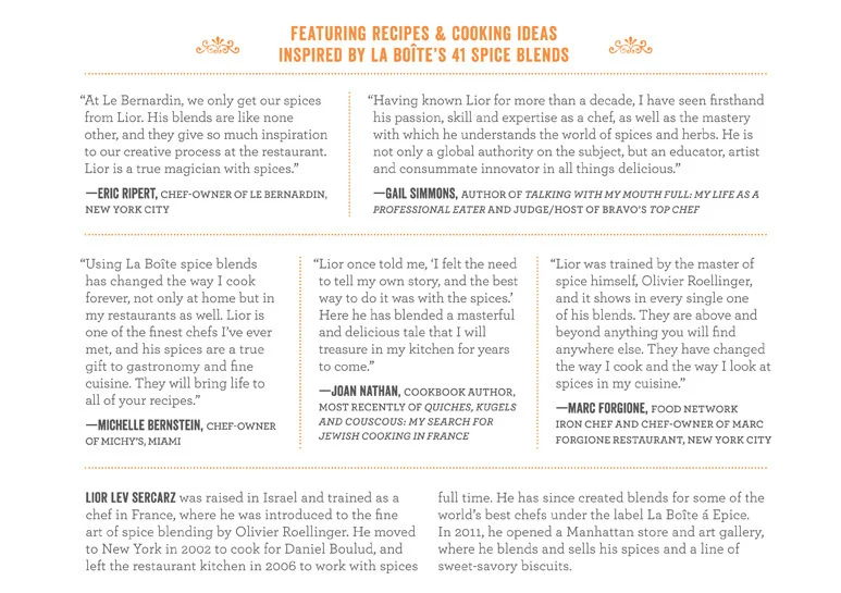 Researched and wrote The Art of Blending cookbook, a collection of recipes and cooking ideas inspired by La Boite's 41 spice blends. With each page, Chef Lior's spice blends come to life through recipes and cooking tips provided by a selection of his esteemed colleagues and friends including chefs Daniel Boulud, Eric Ripert, Michelle Bernstein and Paul Kahan; Parisian baker Apollonia Poilâne, and Top Chef's Gail Simmons. This book encourages you to experiment with spices in new and creative ways, and to experience the essence of faraway cultures even if you never leave your kitchen.